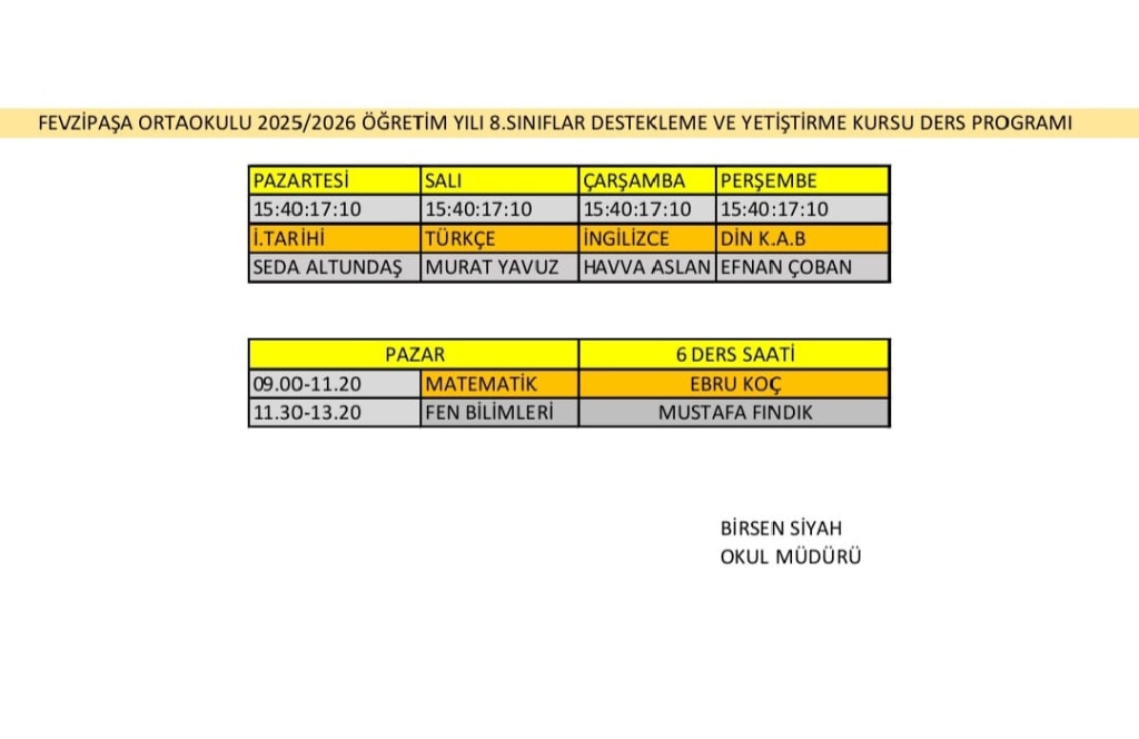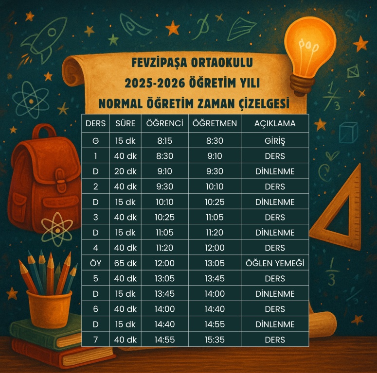 2025–2026 eğitim-öğretim yılı ders saatleri, teneffüs/öğle arası düzeni ve DYK (Destekleme ve Yetiştirme Kursları) gün-saat planı güncellenerek yayımlanmıştır. Öğrenci ve velilerimizin ders ve kurslara zamanında katılımı için güncel Zaman Çizelgesi ile DYK Programı dokümanlarına aşağıdaki görsellerden erişmeleri rica olunur. Gerekli görülen durumlarda yapılacak revizyonlar yine bu sayfadan duyurulacak olup, bilgilendirmelerimizi düzenli aralıklarla takip etmenizi önemle hatırlatırız.